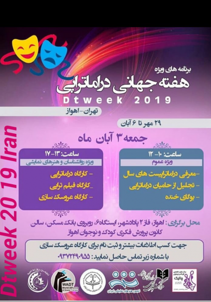 It was announced by the Secretary General of the Iranian Drama Therapy Association. Schedules for Iran's "Drama Therapy" week were announced. The "Abu Ali Sina" badge is awarded to the top two "Drama therapists". Eight doctoral and master's degree therapists from provinces "Tehran", "Khuzestan", "Markazi", "Kermanshah", "East Azarbaijan", "Mazandaran" and "Gilan" are introduced. Celebrating two specialized Drama Therapy Centers in Tehran. Opening of the Drama Therapy Association in Ahvaz Khuzestan province. Appreciation of two professional sponsors of Drama Therapy is a specialized publisher, setting up a Drama Therapy Workshop, a Doll Making Workshop, a Funny Yoga Workshop and a Film Therapy Workshop are other programs of Drama Therapy Week in Iran. Drama Week takes place October 21-27 in Iran and in twenty-five countries.