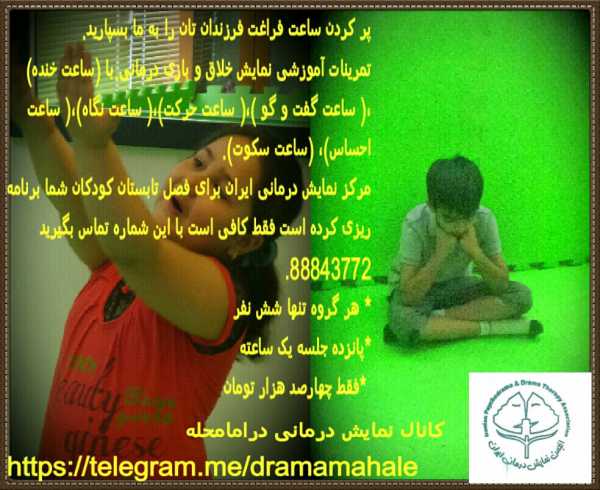 مرکز نمایش درمانی ایران در فضایی شاد و مفرح برای فصل تابستان کودکان و نوجوانان برنامه ریزی کرده است که فقط کافی است با این شماره تماس بگیرید 88843772.